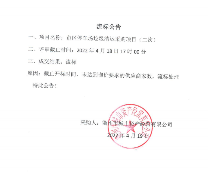 市區(qū)停車場垃圾清運采購項目(二次)流標公告