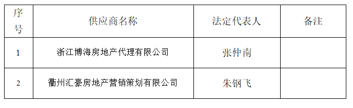 在截止時(shí)間前,經(jīng)審查,以下 2 家符合要求,列入衢州市城市資產(chǎn)經(jīng)營(yíng)有限公司2022-2023年房產(chǎn)銷售服務(wù)入圍項(xiàng)目(二次)合格供應(yīng)商名錄庫(kù)。