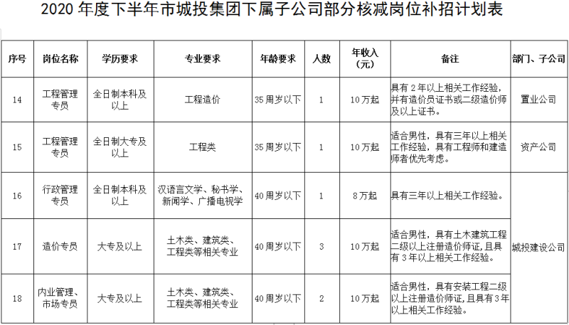 2.2020年度下半年市城投集團下屬子公司部分核減崗位補招計劃表