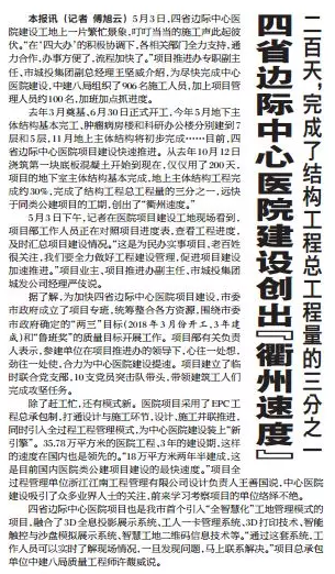 5月11日,衢州日報在頭版重要位置刊登了集團作為業(yè)主單位承建的四省邊際中心醫(yī)院建設(shè)進展,對醫(yī)院實行專班制推進、建設(shè)模式創(chuàng)新、智慧化工地管理等方面給予高度評價,現(xiàn)予以轉(zhuǎn)載。