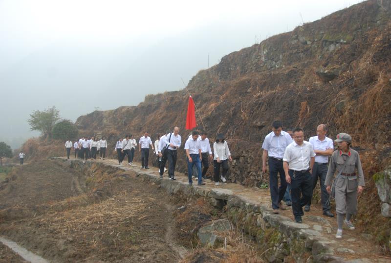 黨員干部們懷著無比崇敬的心情參觀了傅春齡故居,并在故居內(nèi)的巨幅黨旗前莊嚴(yán)宣誓。隨后,大家一起重走了全程2.5公里的紅軍路,紅軍路由大小石塊壘砌成臺階,蜿蜒在山田間,這條路曾是通往遂昌、福建、江西等地的咽喉要道,粟裕將軍率領(lǐng)的挺進(jìn)師就曾經(jīng)走過這里。在沿途,還能見到紅軍墻和紅軍石,紅軍石是一塊巨大的紅砂巖,底下有個(gè)非常隱蔽的洞穴,當(dāng)年老百姓和紅軍常通過這個(gè)洞穴傳遞情報(bào)和糧食。