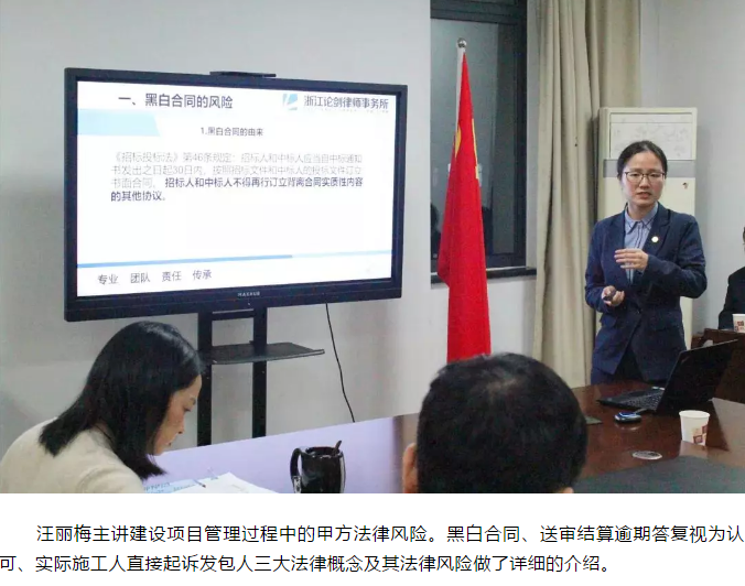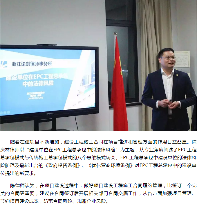 為進一步深化風(fēng)險把控意識,提升風(fēng)險管理能力,最大程度維護集團合法權(quán)益,10月30日晚,集團特邀法律顧問浙江論劍律師事務(wù)所陳慶林律師團隊,開展普法宣傳學(xué)習(xí)活動。集團黨委書記、董事長、總經(jīng)理姜忠軍,副總經(jīng)理王堅威聆聽講座。
