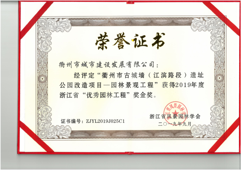 近日,由城發(fā)公司作為業(yè)主實(shí)施的衢州市古城墻(江濱路段)遺址公園改造項(xiàng)目-園林景觀工程榮獲2019年度浙江省“優(yōu)秀園林工程”獎金獎。