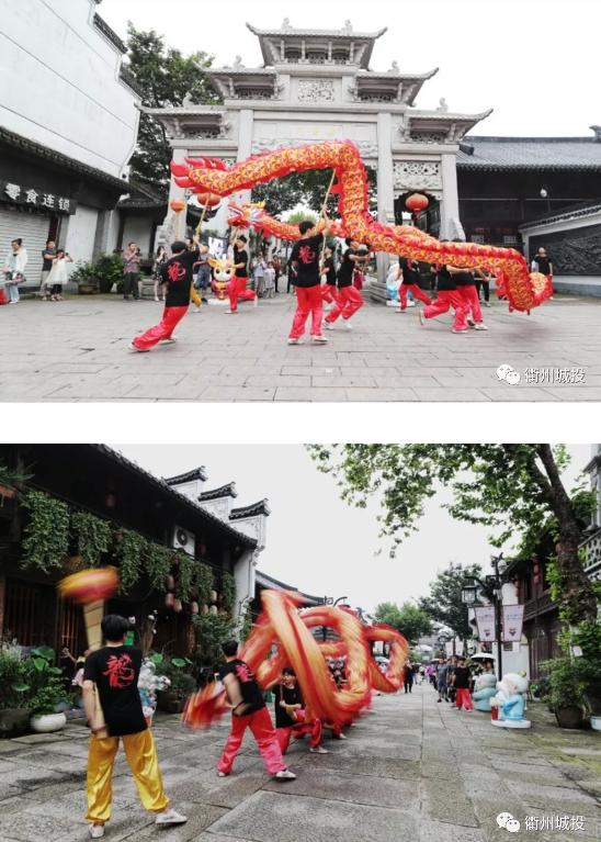 在鼓樂(lè)的伴奏下,來(lái)自衢州中專(zhuān)龍獅團(tuán)的舞龍隊(duì)在水亭街一會(huì)兒俯身游走,一會(huì)兒凌空騰躍,靈活地展示著盤(pán)、游、騰等舞龍動(dòng)作,引來(lái)觀眾陣陣喝彩。